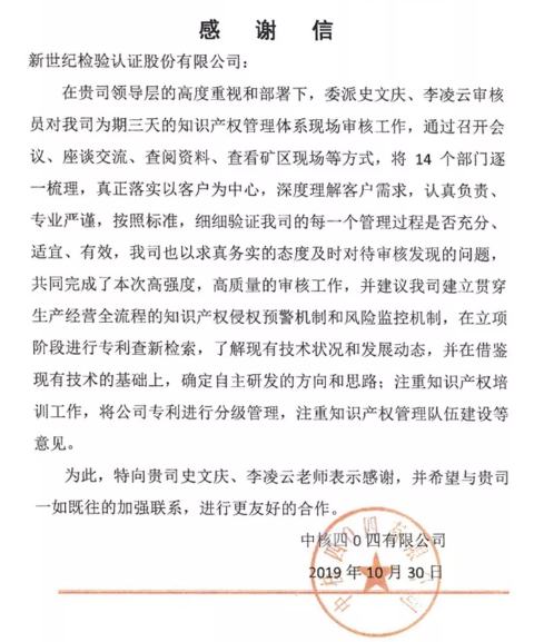 四O四對認證審核工作高度重視、積極配合,順利通過知識產權管理體系的認證審核,證書認證范圍是:與核燃料的加工,核設施退役相關的知識產權管理。在征得公司同意之后,BCC將四O四作為優(yōu)秀貫標案例向國家知識產權局進行了推薦。