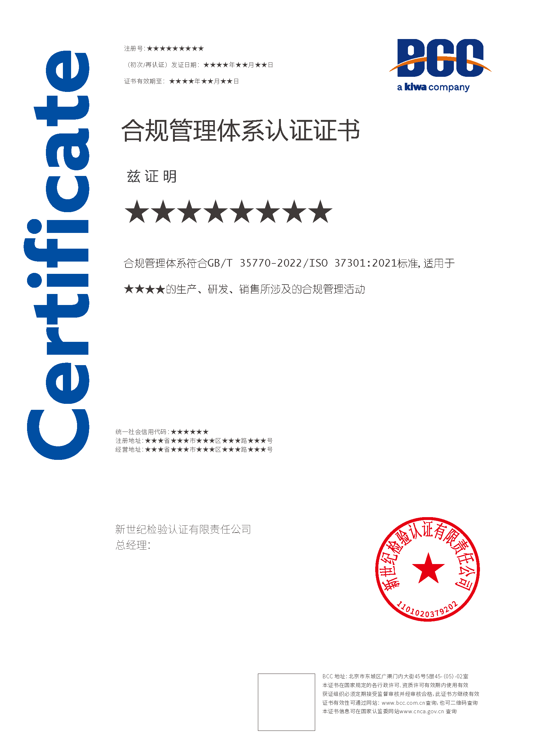 依據(jù)以下標(biāo)準(zhǔn)頒發(fā)合規(guī)管理體系(CMS)認(rèn)證證書: