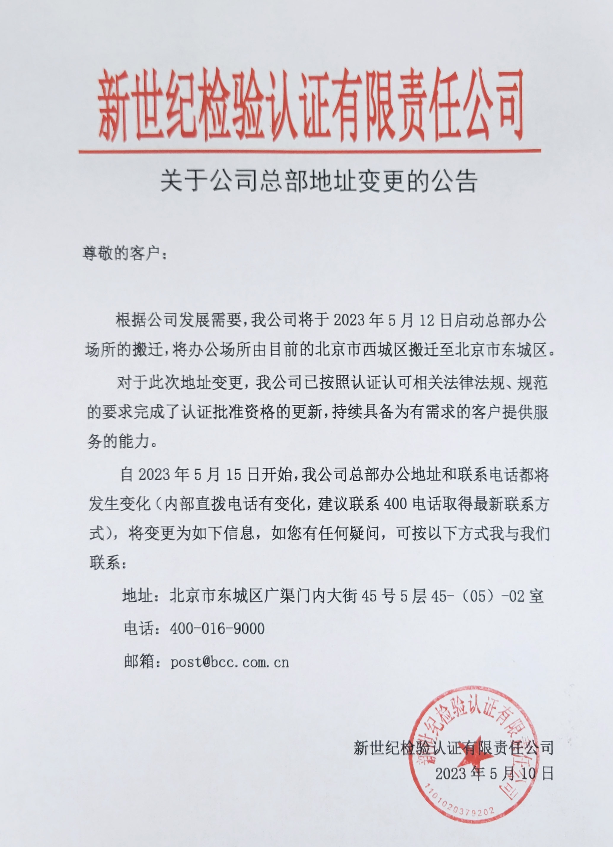 對于此次地址變更,我公司已按照認(rèn)證認(rèn)可相關(guān)法律法規(guī)、規(guī)范的要求完成了認(rèn)證批準(zhǔn)資格的更新,持續(xù)具備為有需求的客戶提供服務(wù)的能力。