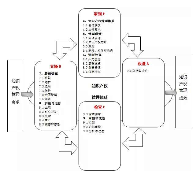 《企業(yè)知識產(chǎn)權(quán)管理規(guī)范》的國家標準以PDCA(策劃、實施、檢查、改進)循環(huán)管理模型為理論基礎(chǔ),以基于過程方法的知識產(chǎn)權(quán)管理模型為構(gòu)建基礎(chǔ),明確以企業(yè)為對象,從企業(yè)知識產(chǎn)權(quán)管理策劃出發(fā),明確企業(yè)產(chǎn)品研發(fā)、擴大市場、防范風(fēng)險、提高效益等知識產(chǎn)權(quán)需求。