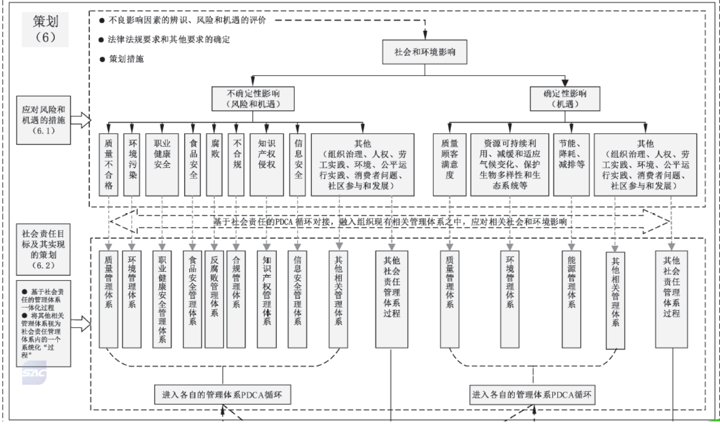 使組織能夠以社會責(zé)任為抓手,從頂層治理(價值觀、使命、精神和發(fā)展戰(zhàn)略等)視野出發(fā),統(tǒng)領(lǐng)、規(guī)范、協(xié)調(diào)和融合組織內(nèi)其他相關(guān)管理體系(如質(zhì)量管理體系、 環(huán)境管理體系、職業(yè)健康安全管理體系、食品安全管理體系、反腐敗管理體系、合規(guī)管理體系、知識產(chǎn)權(quán)管理體系、信息安全管理體系等),有效實(shí)現(xiàn)組織管理體系的一體化。